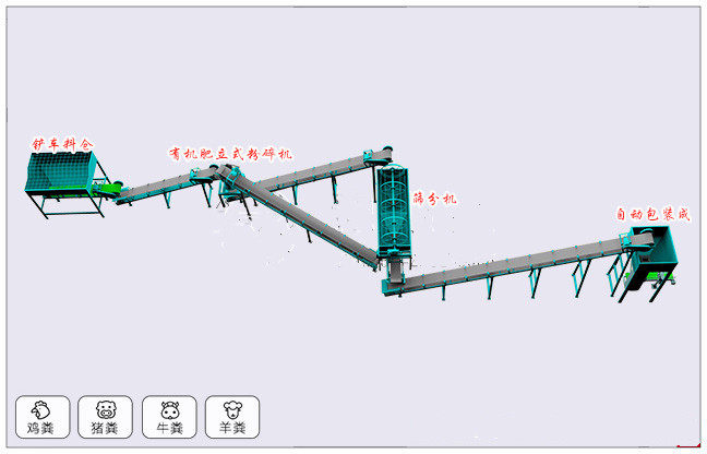 產(chǎn)品描述:粉狀有機(jī)肥料的生產(chǎn)比較簡單。生產(chǎn)設(shè)備主要是五大件:有機(jī)肥翻堆機(jī)、鏟車、定量給料機(jī)、粉碎機(jī)、篩分機(jī)(滾筒篩或者振動篩)。設(shè)備與設(shè)備之前需要用四套皮帶輸送機(jī)連接起來,形成一條完整的生產(chǎn)線,,粉碎機(jī)上面一套皮帶輸送機(jī),連接篩分過的大塊原料。 ,篩分機(jī)上面一條帶連接發(fā)酵物料。 ,篩分機(jī)下面一條帶連接過篩后的